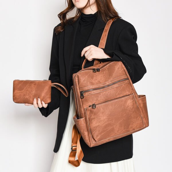 Fabricada con cuero PU (poliuretano de alta calidad), esta mochila ofrece un aspecto premium similar al cuero genuino, pero con la ventaja de ser más ligero, resistente al agua y fácil de mantener. Su acabado texturizado realza su diseño clásico y moderno.